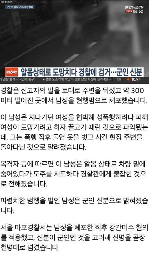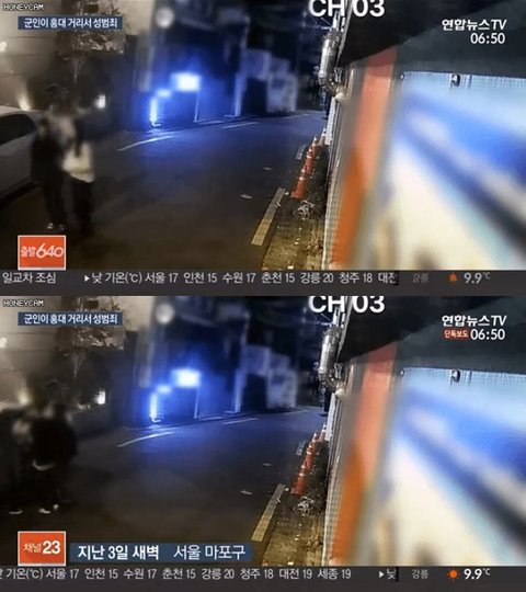 홍대 거리에서 성폭행 시도 실패 후 피해 여성이 도망가려고 하자 끌고가 때린 후에 옷을 벗고 사건 현장 주변을 돌아다니다 알몸 상태로 검거된 군인