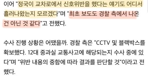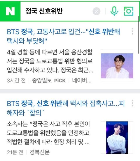 보시다시피 '정국 신호위반' 을 검색하면 뉴스기사에 뜰 뿐더러 기사에도 신호위반이라고 나옴. 하지만 아미들은 위키트리 기사를 가지고 오며, 신호위반이 아니라고 주장함.