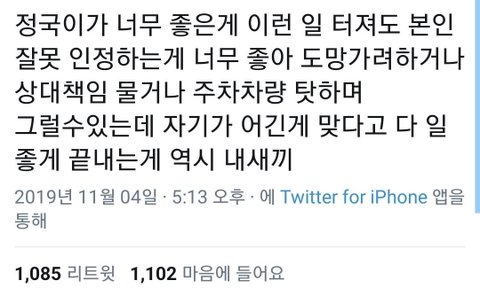 + 번외로 지금 정국이 죽일듯이 까이고 있다며 비난을 멈추라는 팬들도 있는데, 한 마디 하자면 죽일듯 까는 사람 없고 비난하는 사람도 없음.모두 비난이 아닌 비판을 하고 있으며 인신공격 글이나 댓글 본 적 단 한 번도 없음.만약 다른 아이돌들이 법 어긴 후 교통사고 냈다면 지금 판 반응도 이랬을까? 몇 년 동안 판을 해오던 사람으로서 예상하건데, 인신공격 까글이 톡선 도배되고 적어도 3일은 유지될 거임. 그러니까 자신이 정상적인 팬이라고 생각한다면 피코질 그만하고 팬덤 내 분위기 자정에나 신경쓰길 바람...