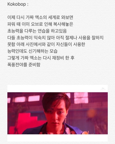 엑소 안무에도 초능력 컨셉 다 들어가있어..! 바람 맡은 세훈이는 특정 안무에서 안흔들린다든가 혼자만 움직인다든가 뭐 그런..