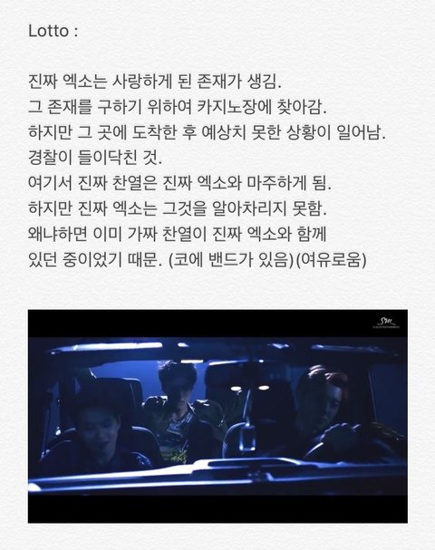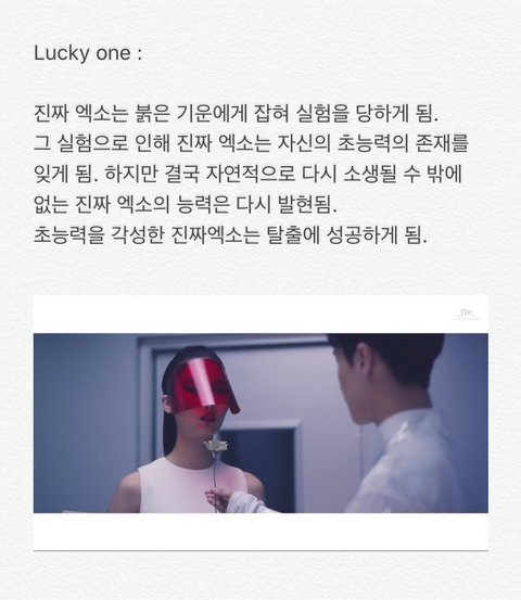 지금 시우민 부재로 얼음 초능력이 없어서 온도가 올라가서 열 감지에 걸려서 잡혀버렸고 디오가 없어서 힘이 없어서 두 세계가 뒤틀린거임 그래서 진짜 엑소랑 만들어진 가짜 엑소인 X엑소가 뒤섞였고 서로가 서로를 못알아보고 엑소가 두 팀으로 대립함 이제 엑소끼리 팀 나눠서 싸우는게 이번 컴백 내용이야 ㅇㅇ 세훈은 데뷔때부터 다른 세계가 있다고 알려주는 조력자고 we are one도 의미가 우리는 하나다인데 이게 진짜 엑소는 하나라는 의미고 x엑소는 are we one이라고 하는데 이건 우리 둘 중 하나라는 의미를 가진거기도함