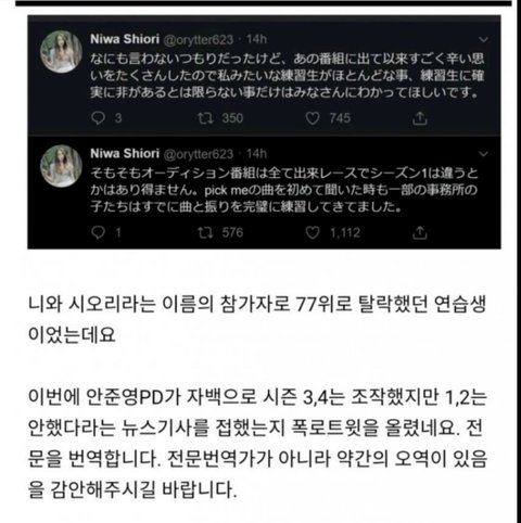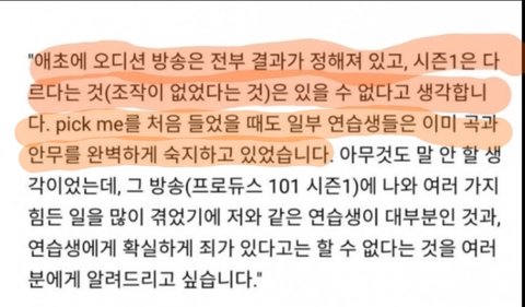 프듀1 참가자가 조작이라고 폭로함ㅇㅇ