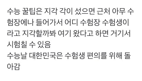 얘들아 나 글쓰니인데ㅜㅜㅜㅜ 누구나 수능날에 변수는 있을 수 있는거야...... 사고가 나거나 뭐 늦잠도 잘 수 있는거고ㅜㅜㅜ 너무 안좋게만 생각하진 말고 그냥 이런방법도 있구나 하고 넘어가줘... 나도 혹시 몰라서 올린거구... 설마 이런걸 악용하는 애들은 없을거라 생각해....