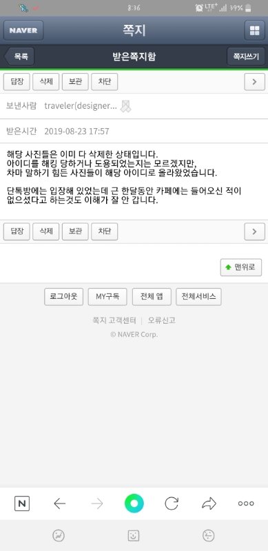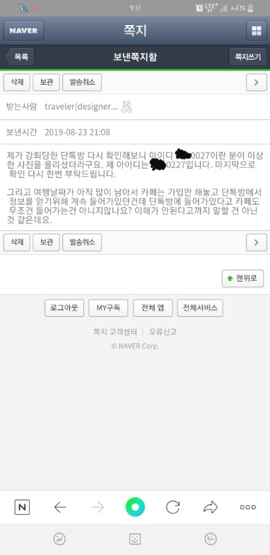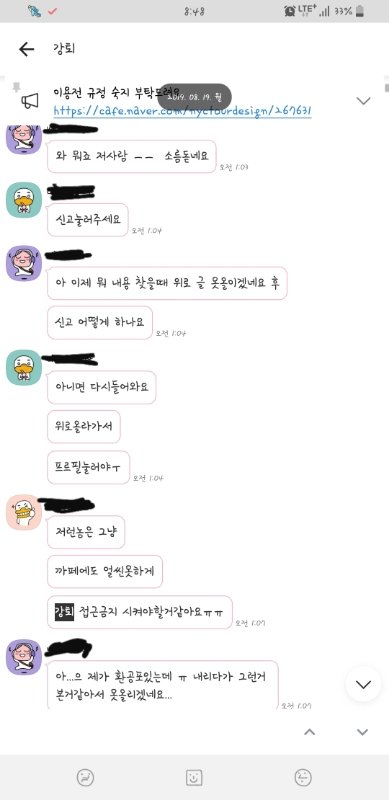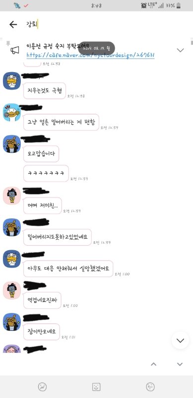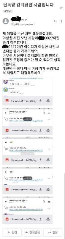 어떠한 설명도 없이 하루 아침에 강퇴를 당해서 운영진에게 쪽지를 보냈더니 제가 단톡방에 이상한 사진을 올렸다고 하더라구요.