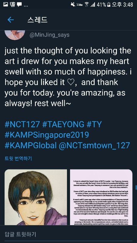 저는 언제나 밝게 별처럼 빛나는 태용이 많은 사람들에게 빛을 주고 힘을 주고 영감을 주길 바랍니다.그는 저의 위안을 주는 사람이자 저의 세상이고,행복이고,저의 집입니다.이태용은 제가 제일 좋아하는 #KAMPer artise이고 또 언제까지나 그러할겁니다.(하트)