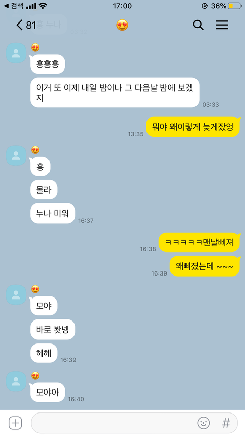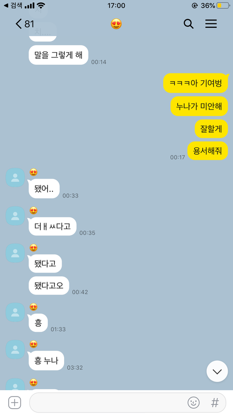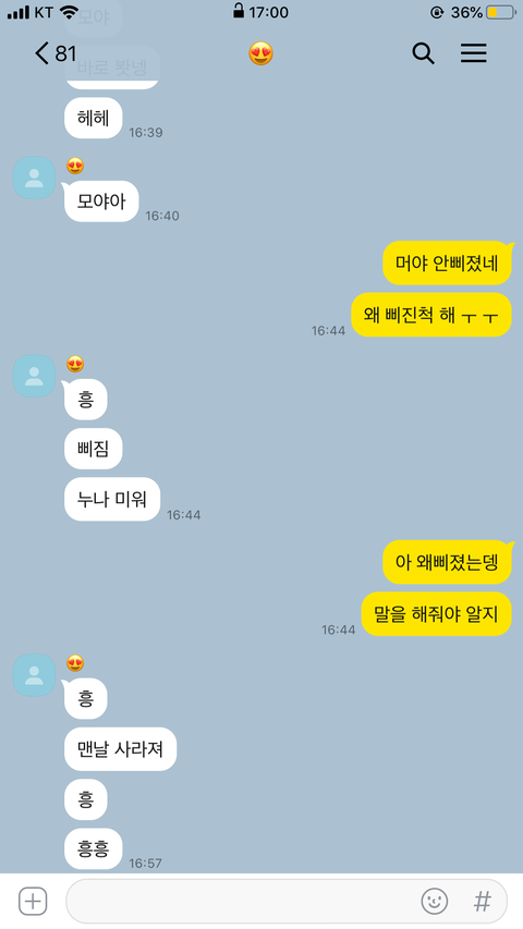 ㅋㅋㅋㅋㅋㅋㅋㅋㅋㅋㅋㅋ애교 존1나 만땅이네 니가 답장 빨리 안해줘서 삐진거같은데 계속 저러기만 하면 짜증날 것 같긴 하다