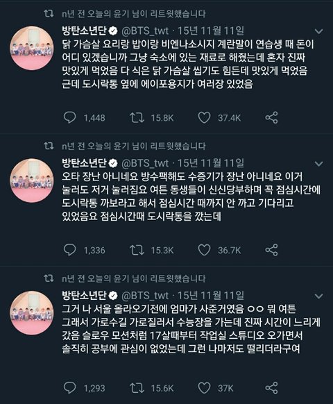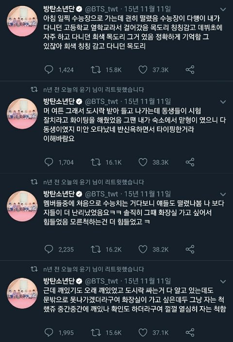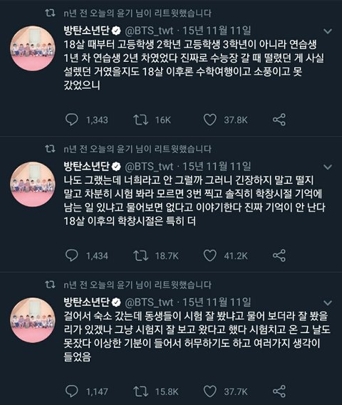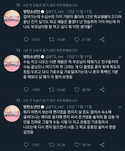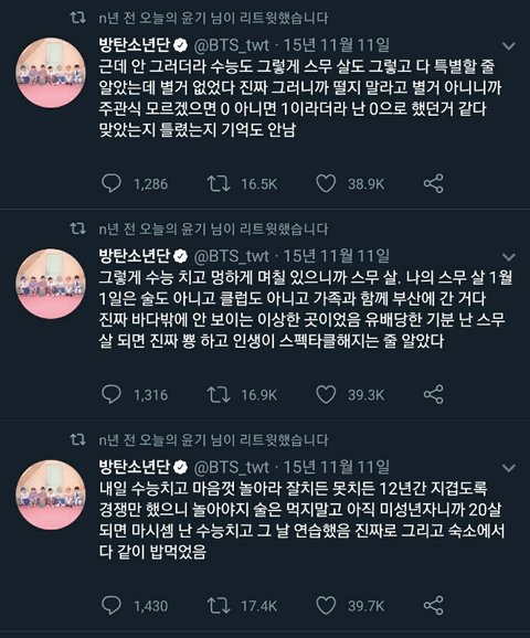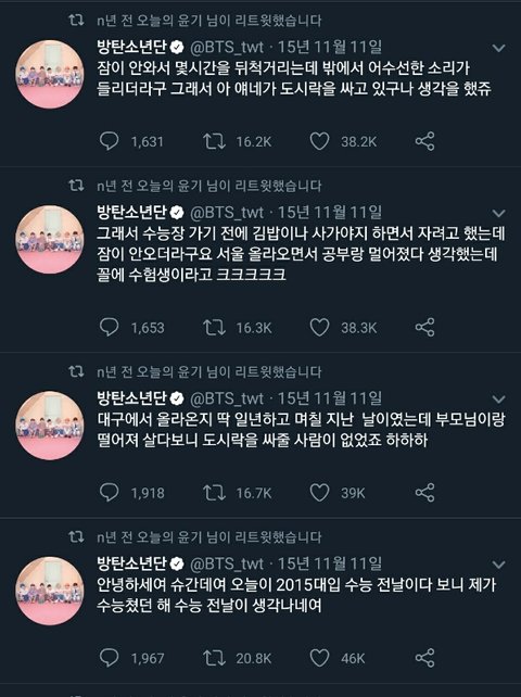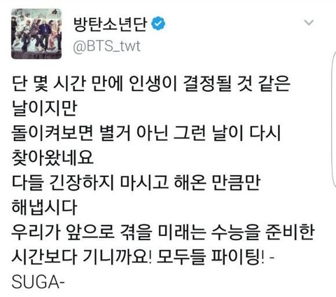 방탄소년단 슈가가 썻던 트윗인데 되게 찡해서 가져와봤어 수험생들이 보고 힘 좀 됐으면 좋겠다 사진 순서는 맞는데 밑에서 위로 읽어야 해