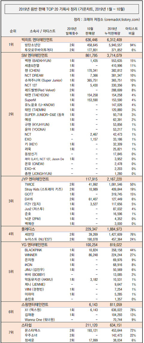 2019 소속사별 앨범 판매량 ㄷㄷㄷ