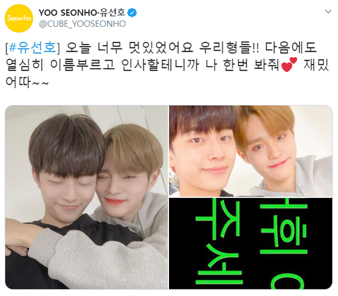 같은 구역에 있었던 팬들말로는 형들한테 손 번쩍 들어서 인사 했는데 못 봐서 실패하고 무대할때마다 계속 손 번쩍 들고 형들 부르다가 뒤에서 우진이랑 대휘 우치와 빌려줘서 계속 흔드는데 결국 실패해서 다시오겠죠?하면서기다렸대ㅋㅋㅋㅋㅋㅋㅋㅋㅋㅋㅋ