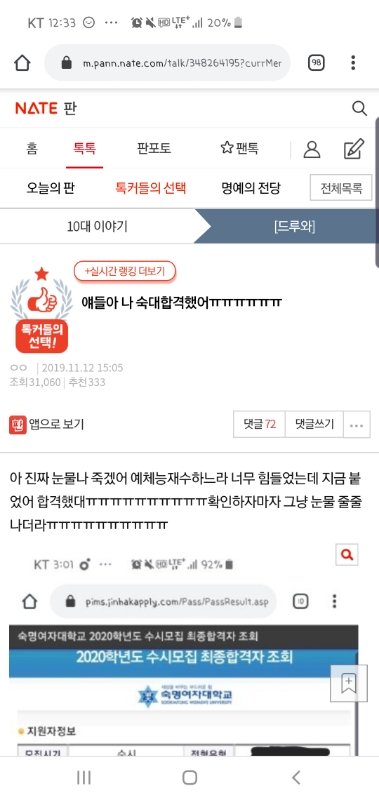 알림이 하나도 안떠서 이렇게 댓글 많이 달렸는지 몰랐어 다들 축하해줘서 너무너무 고마워ㅠㅠㅠㅠㅠㅠㅠㅠ톡선 간것도 너무 신기하다...그리고 과 물어보는 친구 있던데 나 작곡과야...!! 어쨌든 너무 고맙고 다른 친구들 위해서 수능 깔아주러 가려구ㅎㅎㅎ!!! 아직 발표 안난 친구들도 다 결과 좋을거야 마지막까지 화이팅!!!!