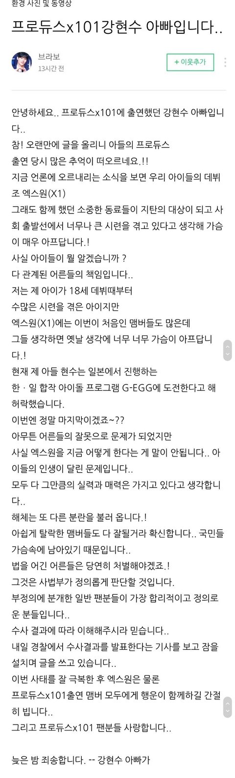 프듀X 탈락 연습생 아버지 글