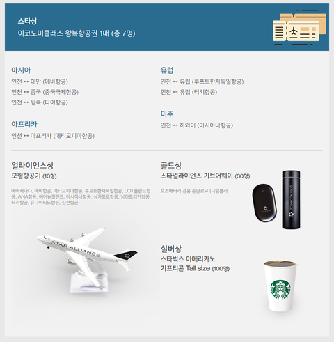 스타얼라이언스에서 관련 퀴즈를 풀면 아시아, 유럽, 미주, 아프리카 지역 갈 수 있는 왕복항공권을 주는 퀴즈 프로모션을 하네요. 이 외에도 스타벅스 아메리카노 기프티콘 100명, 모형항공기 13명, 스타얼라이언스 기브어웨이 30명 에게 준다니 경품은 꽤 쏠쏠
