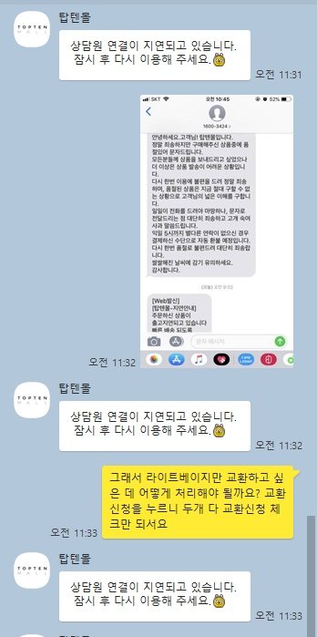 그런데 탑텐 카카오 플러스친구로 분리배송됐고 남은 상품은 영업일 기준 3~5일 이내 배송된다고 연락이 옴 그냥 그런가보다 하고 말았음 (사진 클릭해서 보세요)