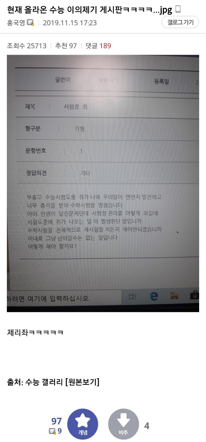 감독관이 쓰러진 곳도 있다던데... 그정도 체력이 인되면 감독관 세우지 말았어야지. 학생이 쓰러져도 시험보는 애들 힘들텐데 왜 감독관까지 이벤트를 만드는거야