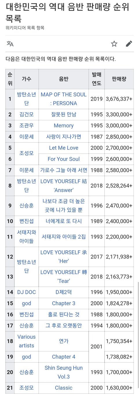우리나라 역대 음반 누적 판매 순위