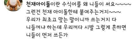 타가수 팬덤이 그냥 지오빠 빠는글에 천재아이돌이란 수식어를 붙였나봄. 빡친 에리들 출동함. 천재가수 천재배우 천재연기자란 타이틀 최초 아니면 다 쓰지마시길 개욕쳐먹음