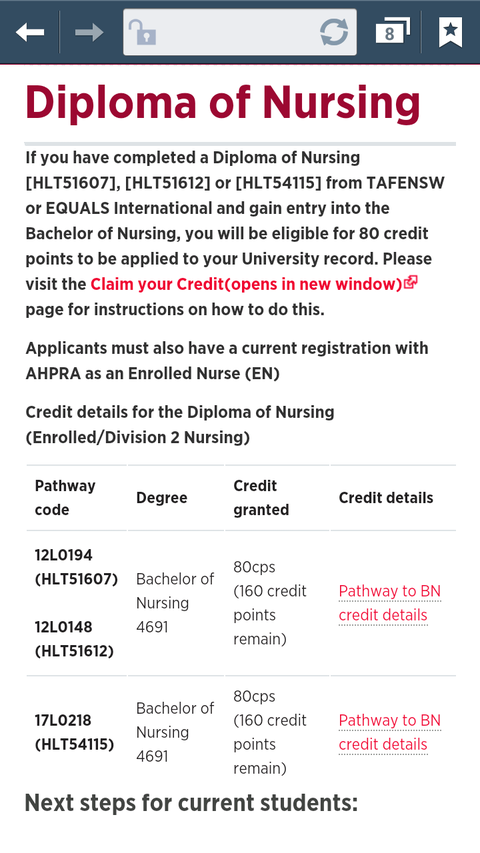 웨스턴시드니대학에서, 간조디플로마 소지자가 간호학과에 진학시 몇 학점을 인정받는지 나와있다. 80학점 인정받는다고 함.