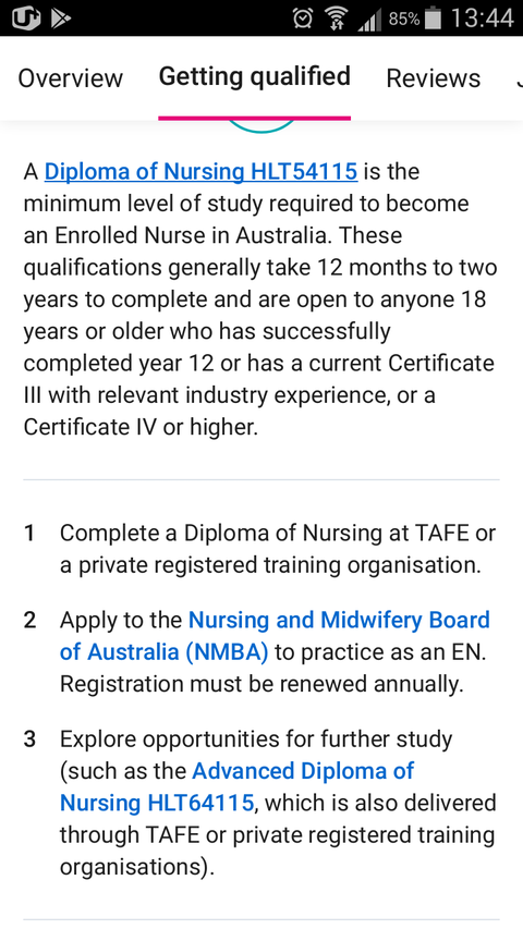To be eligible to apply for registration as an enrolled nurse and to practice in Australia, you must complete a Diploma of Nursing program accredited by the Australian Nursing and Midwifery Accreditation Council (ANMAC) and approved as ‘an approved program of study’ by the Nursing and Midwifery Board of Australia (NMBA ) in accordance with the Enrolled Nurse Accreditation Standards. Visit https://www.ahpra.gov.au/Education/Approved-Programs-of-Study.aspx?ref=Nurse&Type=General&div=Enrolled%20Nurse%20%28Division%202%29 to confirm your chosen Registered Training Organisation (RTO) holds the necessary accreditation.