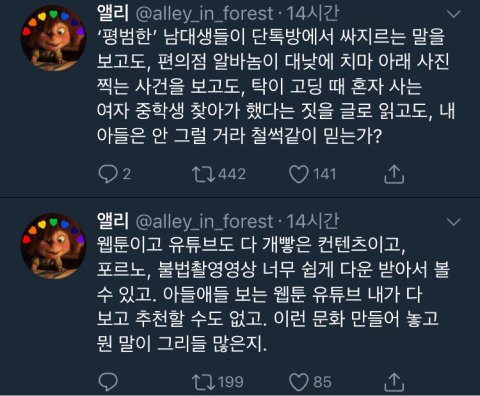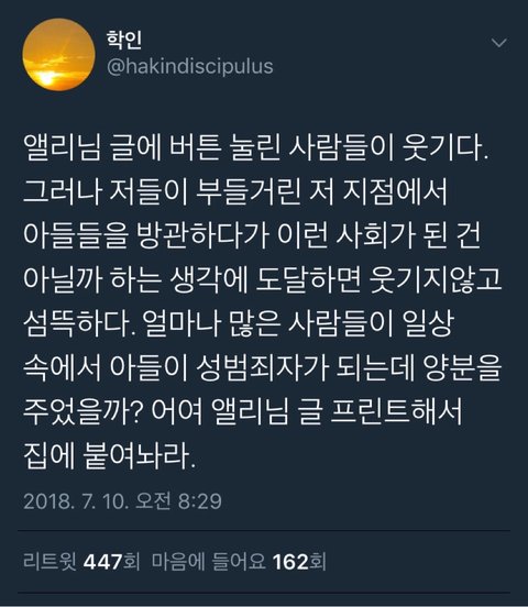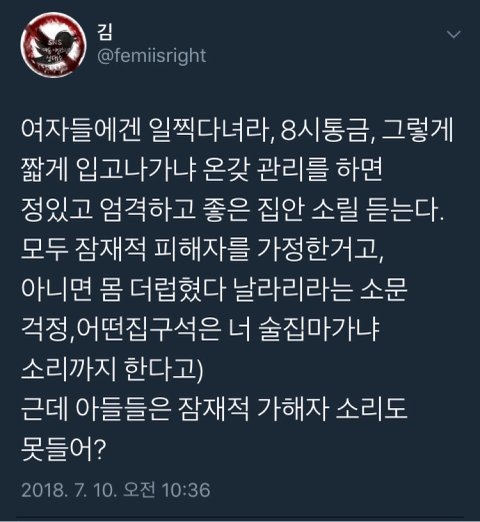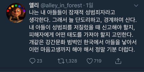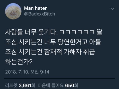 나도 아들엄마임. 근데 말이 어다르고 아다른건데 넌 예비 강간범이니까 매사 조심하란게 정상적인 화법인것인가? 저런 생각 가지고 있으면서 결혼은 어떻게 했지? 친아들한테도 거침없으니까 쫄리냐고? 쫄릴게 뭐가 있나 그 아들이 불쌍할뿐이지.