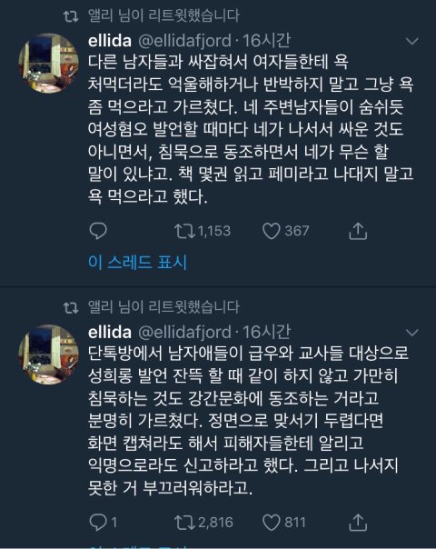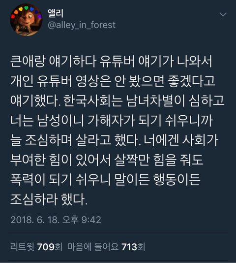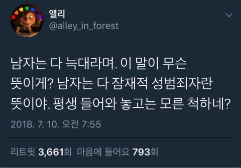 말 안통하는 사람들 진짜 많구나. 다시한번 느낌. 남자는 다 늑대다 라는 말 안 들어본 여자 있나? 그 말을 여자한테만 하기보다 남자들에게 한다는 거잖아 너무 당연한 거 아닌가? 남자는 다 늑대다 = 남자는 다 잠재적 성범죄자다 같은 뜻 맞잖아?