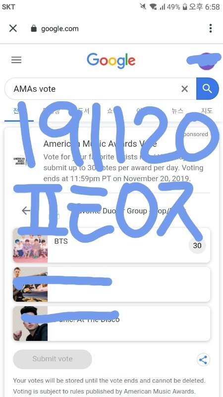 (투표 그까이꺼 9글 계정만 있으면 됨. 투표가 의무는 아니지만 팬으로서 권리행사 할 수 있음. 3부문 하는거 1분도 안걸림 탄이들 상받으면 그 많은 사람 앞에서 '아~~~~미~~~'라고 불러주면 어깨 으쓱 입꼬리 귀에 걸고 기분좋게 축하해주면 됨 ㅇㅇㅋ)