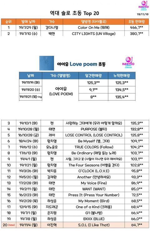 +)아이유 역대 여자 솔로 초동 1위 달성