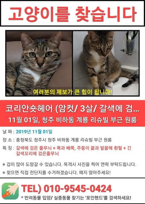 입양자는 저에게 다솜이를 잃어버렸다는 이야기를 11월 9일 전했습니다. 저는 탐정을 부를것과 포인핸드에 글을 올리고 전단지를 뽑을 것을 조언해 주었습니다.