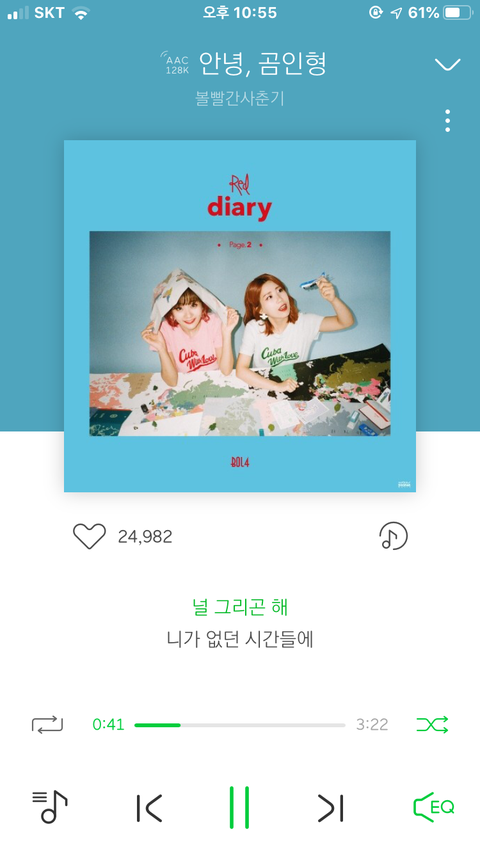 처음에 노래 나올 때 약간 기차타고 추억여행 하는 기분임 가사가 엄청 귀엽지만 나는 우리 할머니가 많이 떠올라 더 챙겨듣는 곡. 내 top3 명곡에 애 들어갈정도록 진짜 좋은데 사람들이 많이 모르더라 이 앨범 자체가 볼빨 앨범에서 최고라고 생각함