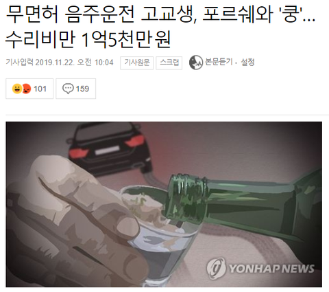 17살 남자 고등학생 만취상태로 아버지의 K7 승용차를 운전하다가 주차된 포르쉐를 들이 받고 뒤집혔으나 타박상만 입음