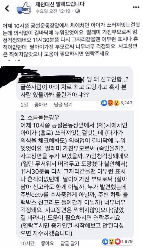 와 진심 소름.. 별 생각없이 보다가 느낀건데 글 보고 있자니 조카 싸함.. 아니 아이 아니더라도 사람이 차에 치여서 쓰러져 있는것 같으면 적어도 생사가 내 손에 갈려있다 싶으면 보통은 119 불러주거나, 112에 신고를 할거임. 엮이기 싫다고는 하나 그 사람을 살리고 말고는 그 순간의 전화 한통에 나뉘기 때문.. 그리고 애가 쓰러져 있는건데 도대체가 차에 치인건지 어떻게 알수있는건지가 의문임.