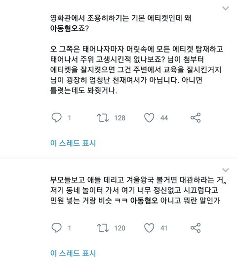 영화관에서 애들이 너무 시끄럽다는 건 아동혐오다 vs 아니다로 싸우는 중