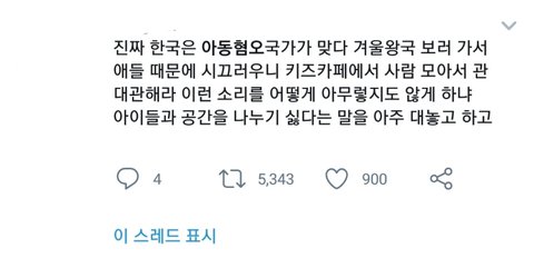 시끄러운 건 아동혐오가 아니라 소음혐오겠지 ㅅㅂ 다큰 어른이 소음내도 싫음