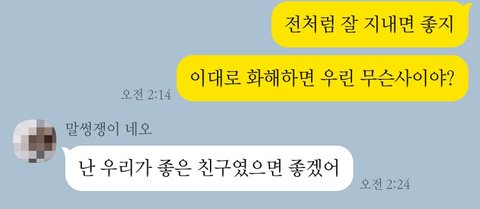 그렇게 아무 말 안하고 지내다가 3일 전에 여자친구한테서 먼저 톡이 왔고 화해하고 전처럼 사이좋게 지내고 싶다고 했어요. 저는 전부터 느낀게 있기도 하고 이 기회에 확실히 해두고 싶어서 화해하고 나면 우린 무슨사이냐고 물어봤는데 좋은 친구로 지내고 싶다고 답이 왔어요. 사실 저는 여자친구를 진심으로 사랑했기도 했고 어떻게 대해야 할지 모르겠어서 힘들것 같은데 이런 말 하는 여자친구 마음도 이해는 돼요.