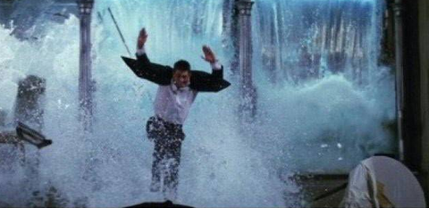 거대한 수조에 담긴 물이 쏟아져 나오면서 좁은 면전에 압력을 가하는 것이 아니라면 그 자체로 생명을 위협하지는 않는다. 하지만 16톤의 물이 쏟아져 나올 때, 빨리 도망가지 않으면 익사할 우려가 있고, 물의 충격량이 그대로 유리나 주변 소품으로 전달되면서 어디로 튈지 모른다.