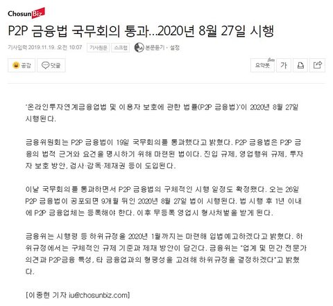 p2p 투자 중입니다. 여기 투자해보면서 잃어보기도 아직 묶인돈도 있고 해서지금은 투자처를 확 줄이고 연체율 낮은 곳으로만 봐서디에**드, 탱커*드, 프*핏 에 투자중인데 법제화 된다면 부디 투자자들이 안심하고 투자하기 좋은 환경이 됐으면 싶읍니다.