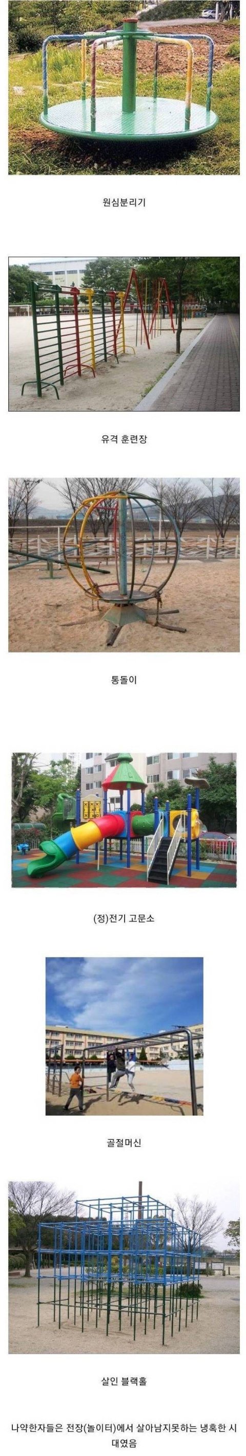 통돌이는 안에 친구들 두세명 세워놓고 밖에서 걍 ㅈㄴ돌리는거임 그 속도가 정말 어마어마해서 돌리다가 봉을 돌릴 수 없을 정도로 빨라져서 어쩌다 타이밍이 어긋나 봉에 손이라도 맞으면 학교에서 선생님께 손바닥 맞은 통증이 아직 남아있어 통증이 배가 됨. 그렇게 아픈 상황에서도 만렙찍은 아이들은 통증을 이기고 겨울에 얼음보다 차가운 철로 된 봉을 잡고 최고 속도가 되었을때 봉에 매달려서 통돌이와 물아일체를 이루어 원심력속에 빨려 들어감. 이런 고수들 특징이 신발은 슬리퍼에 발가락이 ㅈㄴ 튀어나와 있다. 보통 세명정도 매달려서 무아지경으로 돌아감. 근처에서 생라면 까만봉다리에 넣고 먹으면서 알짱거리다가 휘날리는 다리에 아구창 쳐맞고 날라가는 얼빠진놈들도 다수있었다. 회전이 멈추면 연처럼 휘날리던 아이들 비틀비틀 안에 들어갔던 애들 비틀비틀 아구창 맞고 피흘리며 울고있는 아이 대환장 파티가 따로 없음. 그래도 좋다고 깔깔 거리며 웃으며 각 집의 엄마가 저녁먹어라고 부를 때까지 놀던 그때 그시절 응답하라
