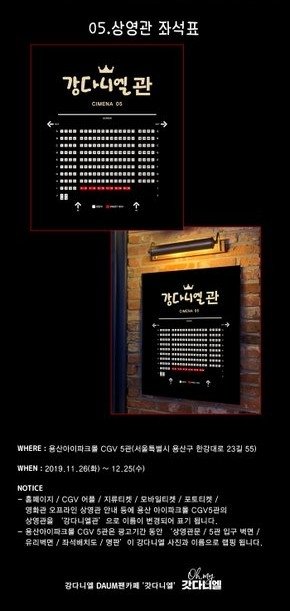 https://twitter.com/DIEUDANIEL_DAUM/status/1198949519368409088 기간: 2019.11.26.(화)~12.25.(수) 장소: 용산아이파크몰 CGV 5관
