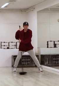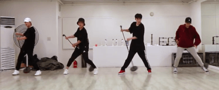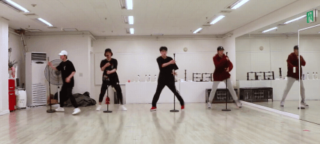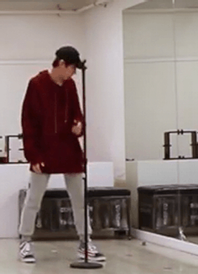 스탠딩 마이크와 함께 열심히 안무 연습중인 아이돌