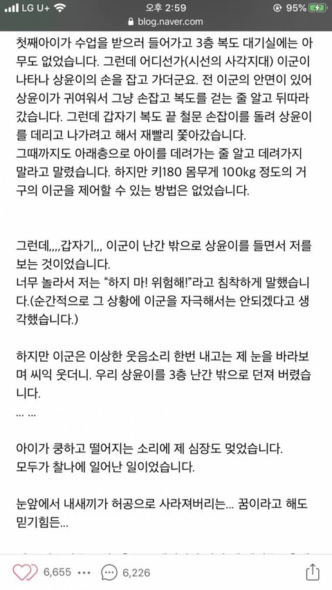 눈앞에서 던져지는 애를보고도 아무것도 못했다고 엄마는 밤마다 자책할테고 모르는사람들에겐 원망도 듣겠지 죽을때까지 그 장면이 눈앞에서 재생되는 고통을 안고 살텐데 그 장애아는 해맑게 웃으면서 살겠지 그 부모는 애가 뭘알겠냐 모르고한건데 내새끼 우쭈쭈하고 지새끼 어디 털끝하나 다칠까봐 둥가둥가하겠지.. 법이 참 줬같다 정신이 온전치 못한사람이 사고를 치면 오히려 더 엄하게 벌해야하는거 아닌가? 몰랐을거란 이유로 담엔 똑같이..혹은 더 심하게 남에게 상해를 입힐수도 있을거란게 불보듯 뻔한데? 저 애가 다음에 또 그러지않을거란 확신이 있나?
