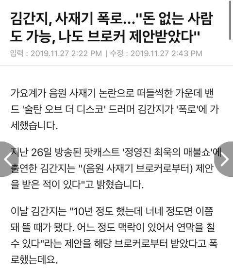 + 술탄 오브 더 디스코의 그룹에 드러머 김간지라는 분이 사재기 제의 받음 적 있다고 폭로함 그래서 추가함