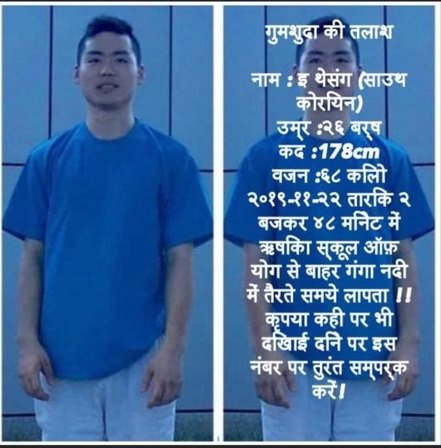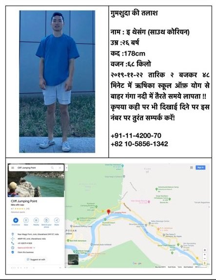갠지스 강 인근 부근 & 리시캐시 요가 연수원 부근 에서 흡연을 위해 잠시 나온 인도 시민께서 수영하던 사촌동생이 헬프를 외치며 도움을 청하는것을 목격하여서 신고 하였으나, 수사에 대한 대책이 늦어져 결국 실종상태 입니다.