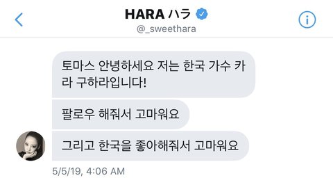 한국어 트윗하는 토마스 맥도넬 트위터인데 구하라가 생전에 이렇게 디엠 보냈었나봐ㅠㅠㅠㅠㅠㅠ