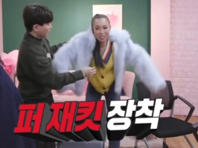 이제 메이크업은 끝났고, 퍼 재킷을 입는데