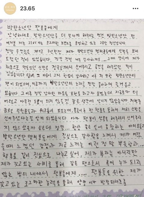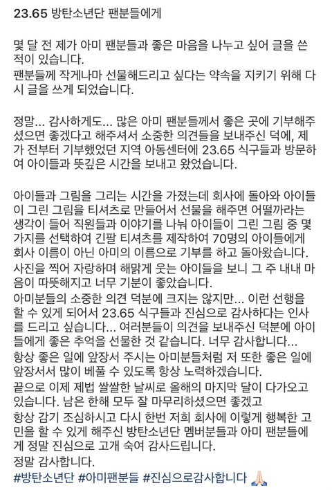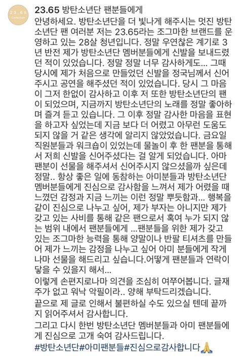 아.... 난 진짜 이런게 너무 좋아ㅠㅠ 꾹이가 신었던 운동화로 판매자님이 감사하다고 아미들에게 선물주고 싶다고 했더니 오히려 기부를 해주세요, 라고 해서 또 착한 판매자님은 기부를 해주시고 그 과정에서 아이들이 그린 그림으로 또 티셔츠를 제작해서 아이들에게 다시 선물을 하고 이런게 진짜 선한 영향력이고 선순환이고 아미고 방탄이고 세계평화의 밑거름 아니겠냐ㅠㅠㅠㅠㅠㅠ 그래서 저 텍 있는거 사려면 어디가면 되는건데ㅠㅠㅠ