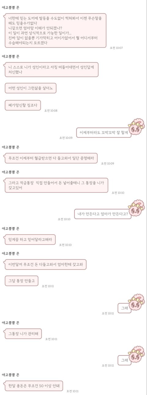 근데 엄마가 이렇게 하면 난 솔직히 '120씩 타이트하게 모아서 뭐 나중에 자기돈일것마냥 군다' 이렇게 생각들거든..