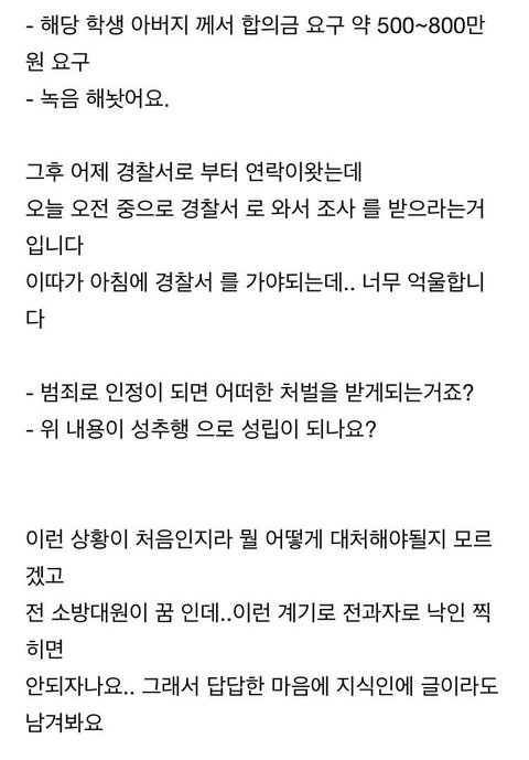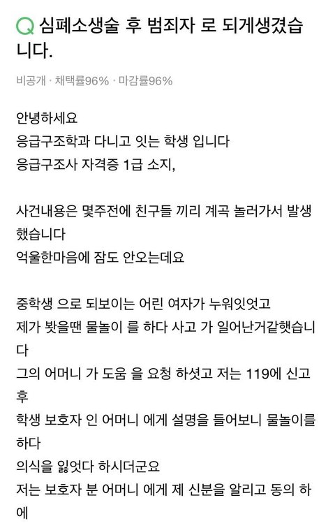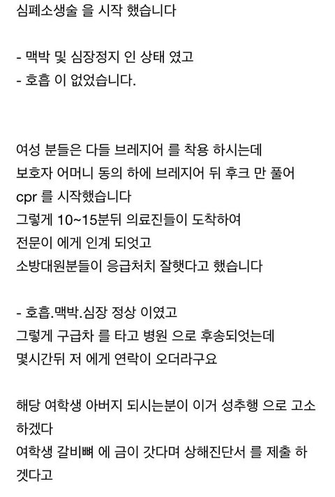 응급구조사 자격증도 있는 사람이 사람을 구했는데 학생 아버지가 고소를 하겠다고 한다고 그게 고소가 되겠습니까. 설사 고소가 된다해도 판사 변호사 검사가 허수아비로 앉아있는것도 아니고, 뻔히 응급상황에서 cpr하다보면 갈비뼈 부러지는 일은 흔하게 있는 일이고, 응급상황에서 사람들이 둘러서서 보고 있는 상황일텐데 거기서 cpr하기도 바쁜데 성추행을 한다는게 말이 되냐구요. 암만봐도 자작같은데 진짜 자작도 짜증나는 자작이네.