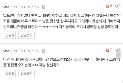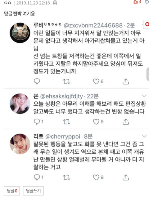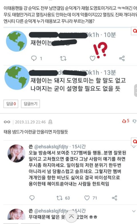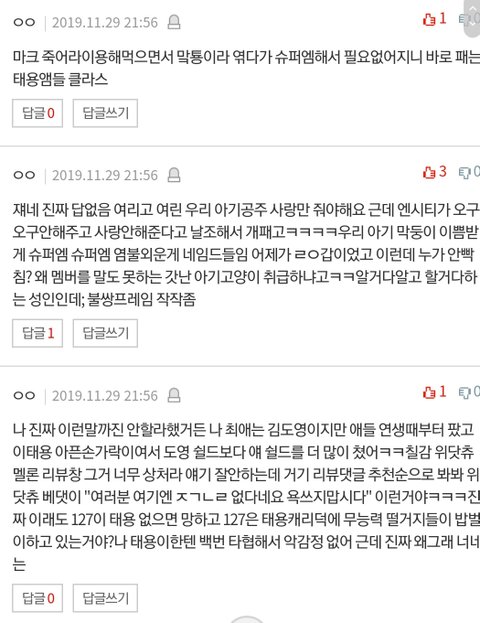 ㅈㄴ환멸나 최애는 안밝히겠지만 여기서 트페미만 내최애패는소재로 잘못한거맞다고 추천 20에 멤버왜까냐니까 나보고 악개냐더니 이태용이 똑같은일하니 먹금하자하고 태용 학폭은 쉴드침ㅋㅋㅋ개환멸ㅋㅋㅋ그거 어디서도 안까이는데 트위터랑 팬톡에서만 까였음