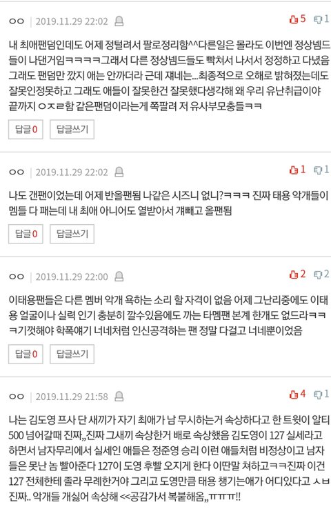 태용팬들 눈막귀막해봤자 어제 재프도프맠프해프 다 빡치고 태용 팬 다 비판하고 너네먹금시작했음 돌판왕따될지경임 ㅅㅍㅇ올팬이 어딨어 걔네도 다알고 태프비판하더만 갠팬이면서 이럴때만 ㅅㅍㅇ다른애들 이용한다고ㅡ다 태프가 위장한거고 국내팬 천명도 안되서 멜론하트 천도 안찍히는데ㅋㅋㅋ너네만 ㅅㅍㅇ부심으로 ㅇㅅ멤 ㅇㅅㅌ멤 패고다님 정신차려
