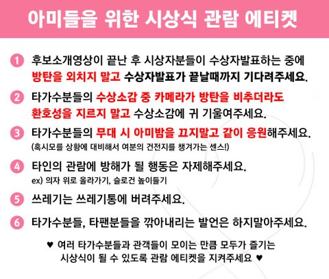 작년 시상식에서 나도 정말 많이 느낀 부분이었거든ㅠㅠ 호응은 탄이들이 수상할 때, 무대할 때 많이 해주자!!