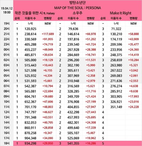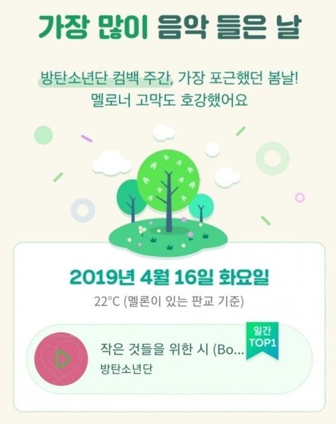 - 올해 멜.론에서 음악을 가장 많이 들은 날은 방탄 컴백 3일 후 일간 1위 유지한 날(아이돌 컴백하면 듣는 사람이 빠진다는데 다 개소리로 판명)